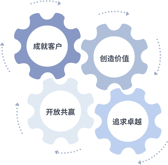 成就客户是一切决策的出发点,,创造价值是衡量所有工作的标准,,,,追求卓越是我们做事做人的态度,,,,开放共赢是我们的格局也是最终的结果。。。价值观的齿轮环环相扣,,,推动着组织里的每个人不断向前。。
