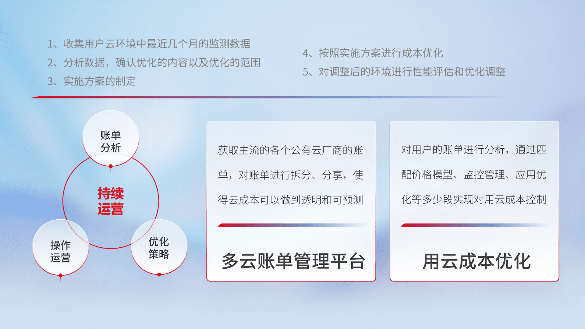 通过多云纳管,,,,以统一的资源数据模型把客户的云资源进行抽象和封装,,,,进而实现对多云资源的统一操作,,,保障云资源管理的可靠性、、、、稳定性与可用性。。。量身定制化运维内容,,,配置、、开发运维、、、、补丁管理、、、备份、、、监控、、、、认证和访问管理、、审计和日常巡检等,,,,保障在用云过程中的可靠度,,,,稳定度以及高可用率。。